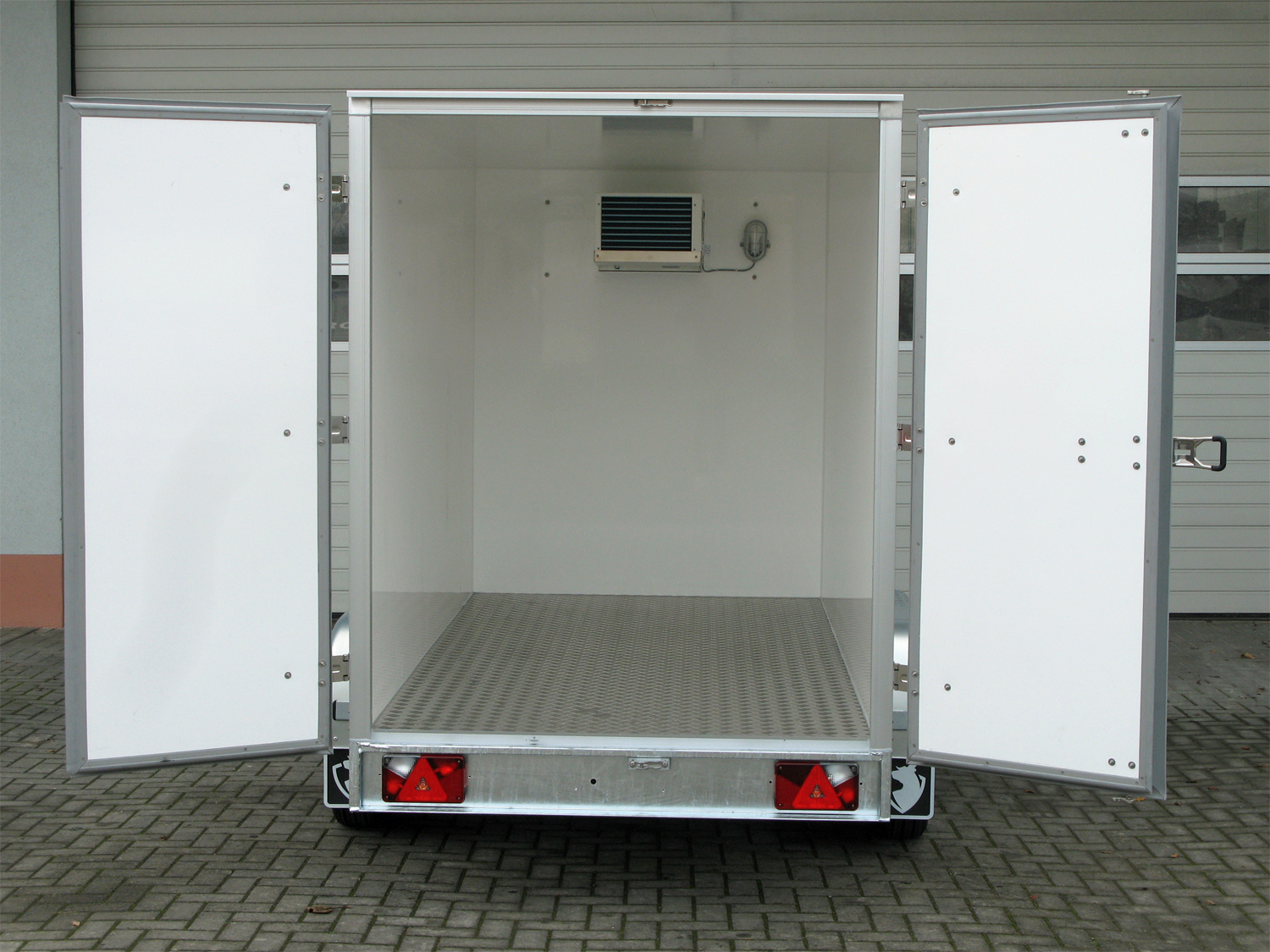 Der Anhänger verfügt über Scharniere und Verschlüsse aus Edelstahl. An der Vorderseite ist ein leistungsfähiges Kühlaggregat in einem robusten Gehäuse angeordnet. Auch ein Verlängerungskabel mit Netzstecker, Innenbeleuchtung und eine abschließbare Bedienkonsole gehören zur Serienausstattung. Kurz gesagt, ein voll ausgestatteter Kühlwagen, dessen glatte Gelcoat-Außenwände sich außerdem auch noch gut zur Anbringung von Aufklebern eignen, sodass Sie mit dem Kühlwagen gleichzeitig Werbung machen können!