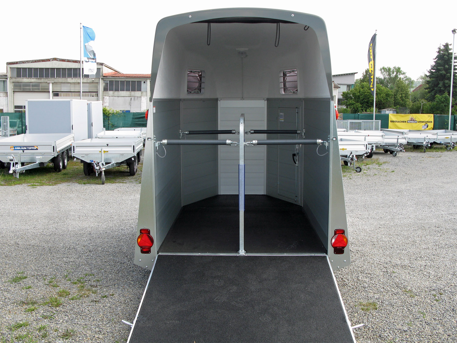 Die Pferde profitieren von den geteilten Brust- und Heckstangen mit Panikentriegelung, den getönten Ausstellfenstern in der Polyhaube und dem Windschott, das für zugfreie Innenraumbelüftung sorgt. Die verriegelbare Trennwand EquiLock® lässt sich leicht bedienen und sorgt für sicheren Halt auch bei geöffneter Heckklappe.
