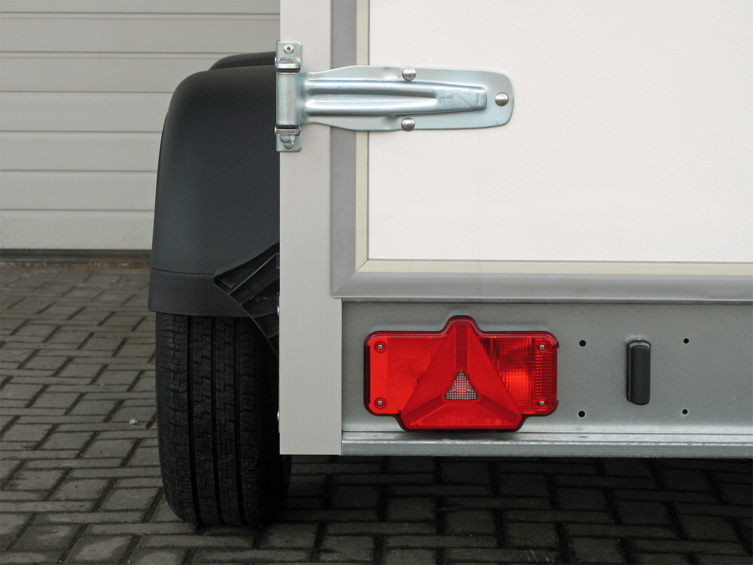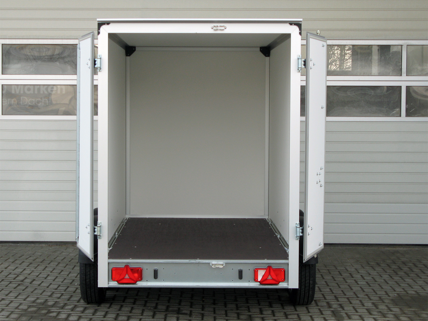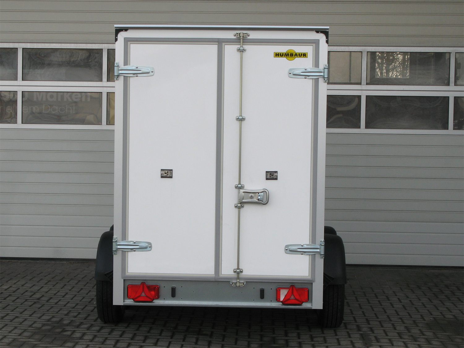 Im Innenraum ist für eine bessere Sicht eine Leuchte montiert. Alle Plywood-Koffer sind mit Scharnieren und einem abschließbaren Drehstangenverschluss aus verzinktem Stahl ausgestattet. An den Türen sind Dichtungen aus Kunststoff montiert, die ein wassergeschütztes transportieren Ihrer Ware ermöglichen. Die Aluminiumverstärkungen im Dachbereich und an der Stirnwand unten verleihen den Plywood-Koffern von Humbaur eine extreme Stabilität.