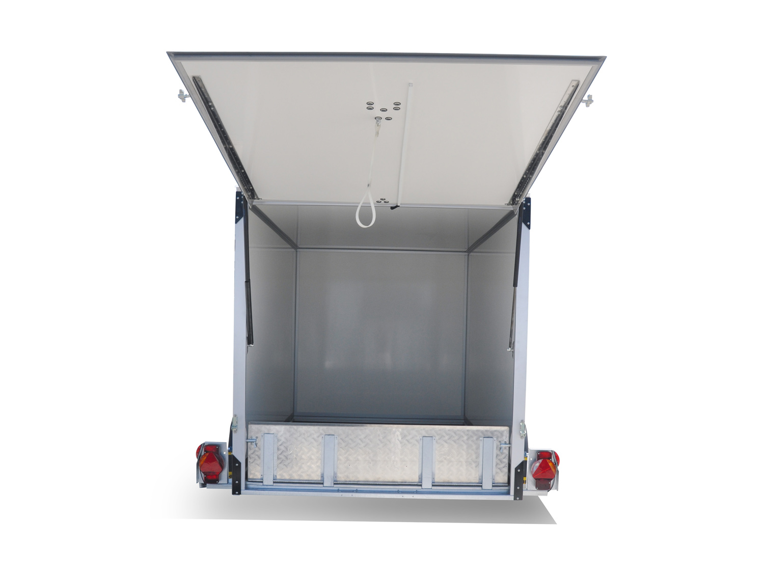 Der clevere Kofferanhänger mit intelligenter Absenkmechanik. Die Ladefläche kommt Ihnen beim Be- und Entladen entgegen. Es entsteht ein flacher Auffahrwinkel von nur 4 bis 6 Grad. Mit der integrierten Auffahrklappe und nach oben öffnender Heckklappe ist dieser Anhänger der perfekte Partner für bequemes Verladen. Ein robuster, rutschhemmender Boden und stabile Seitenwände mit GFK-Beschichtung sorgen für Langlebigkeit. Mit einer optionalen Wippe perfekt zum Transport von Motorrädern geeignet.