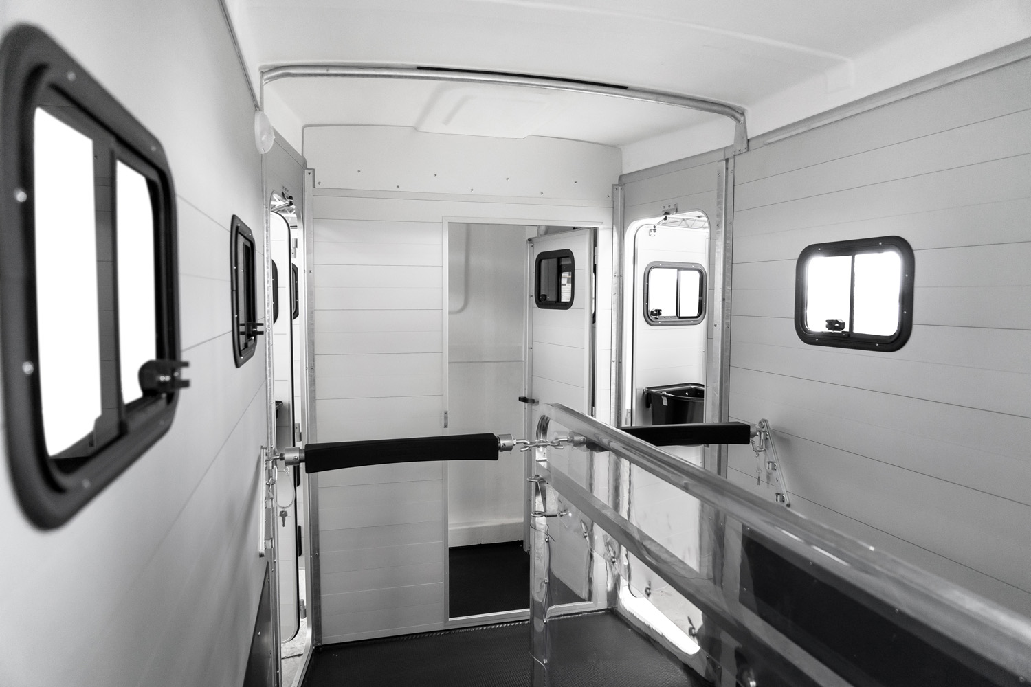 - abschließbare begehbare Sattelkammer mit klappbarem Sattelhalter und Klappsitz, Stiefelknecht, Trensenhalter, Spiegel, Netz, Innenbeleuchtung, Schaufel und Besen