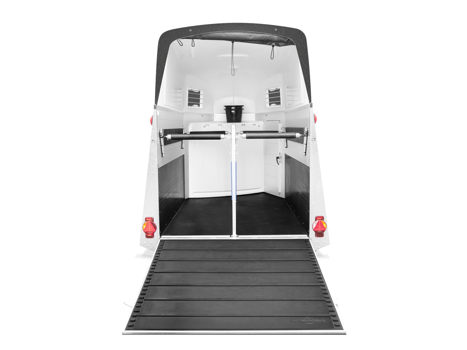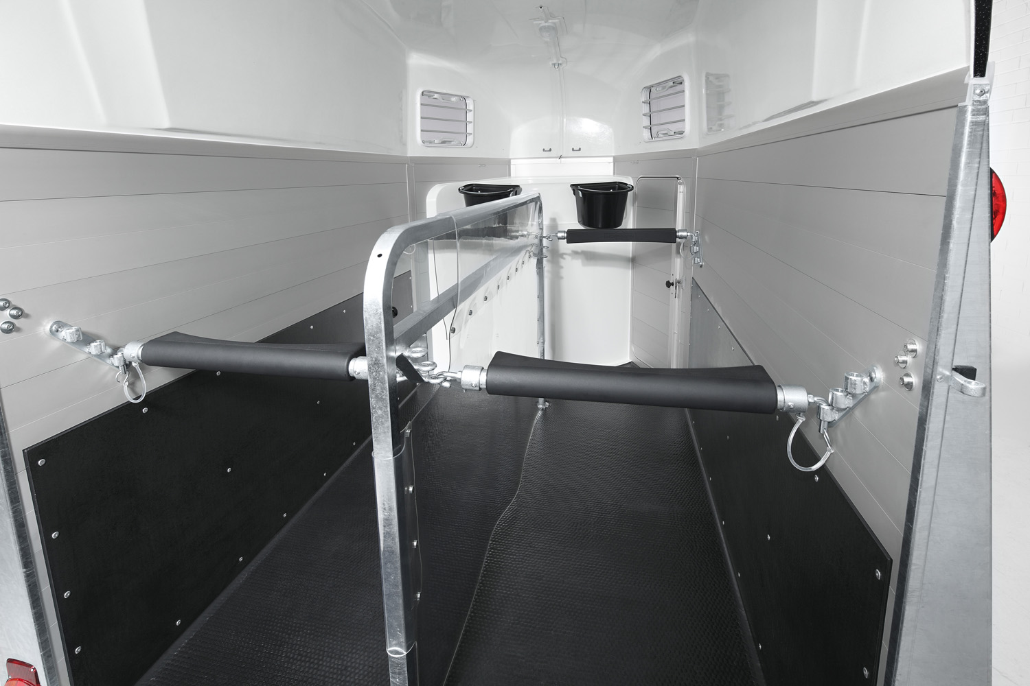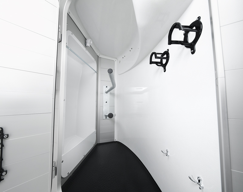 - Abschließbare Sattelkammer mit Sattelhalter, Trensenhalter, Spiegel, Netz, Innenbeleuchtung, Schaufel und Besen