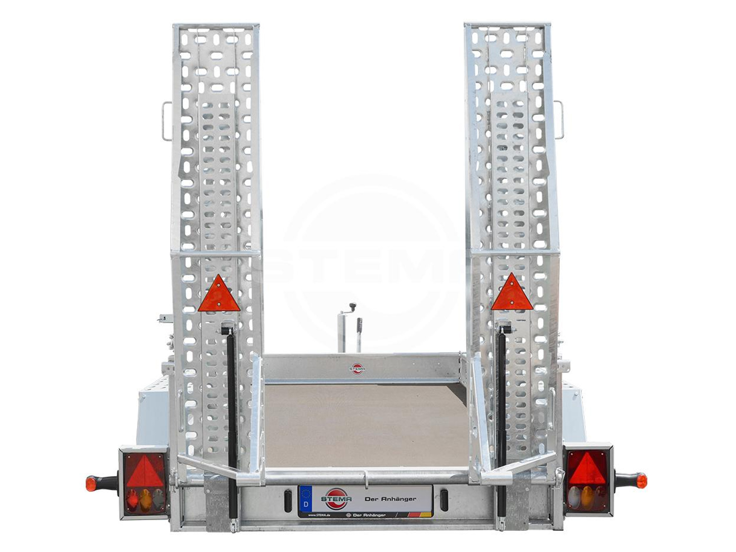 Für jeden Einsatz. Der universell einsetzbare STEMA-Baumaschinentransporter ist der ideale Begleiter für den gewerblichen Einsatz. Baumaschinen und andere Arbeitsgeräte lassen sich durch den extrem niedrigen Auffahrwinkel (18°) über die stabilen Auffahrrampen (1,70 m lang) mühelos verladen. Die Ladehöhe beträgt ca. 46 cm.