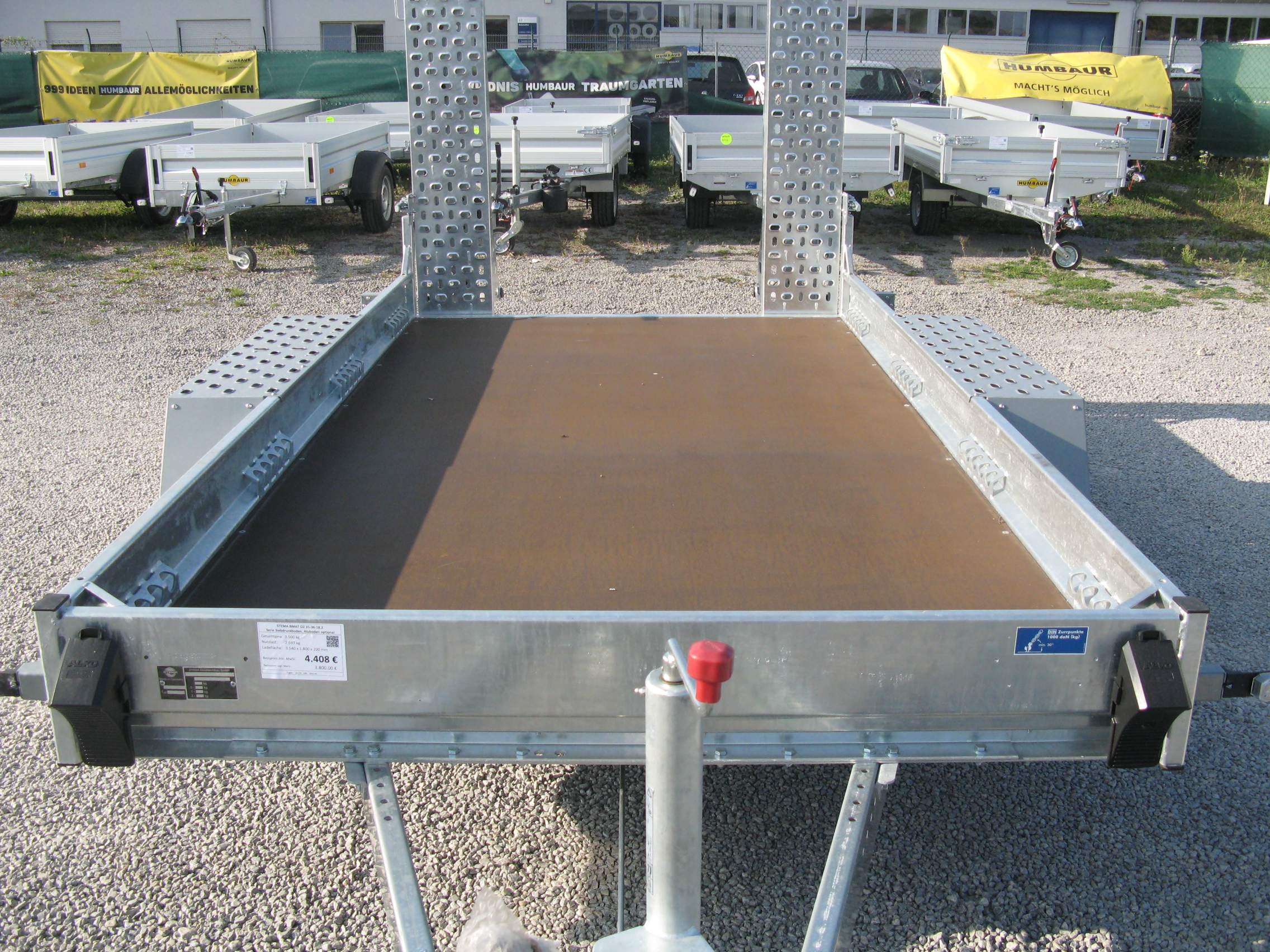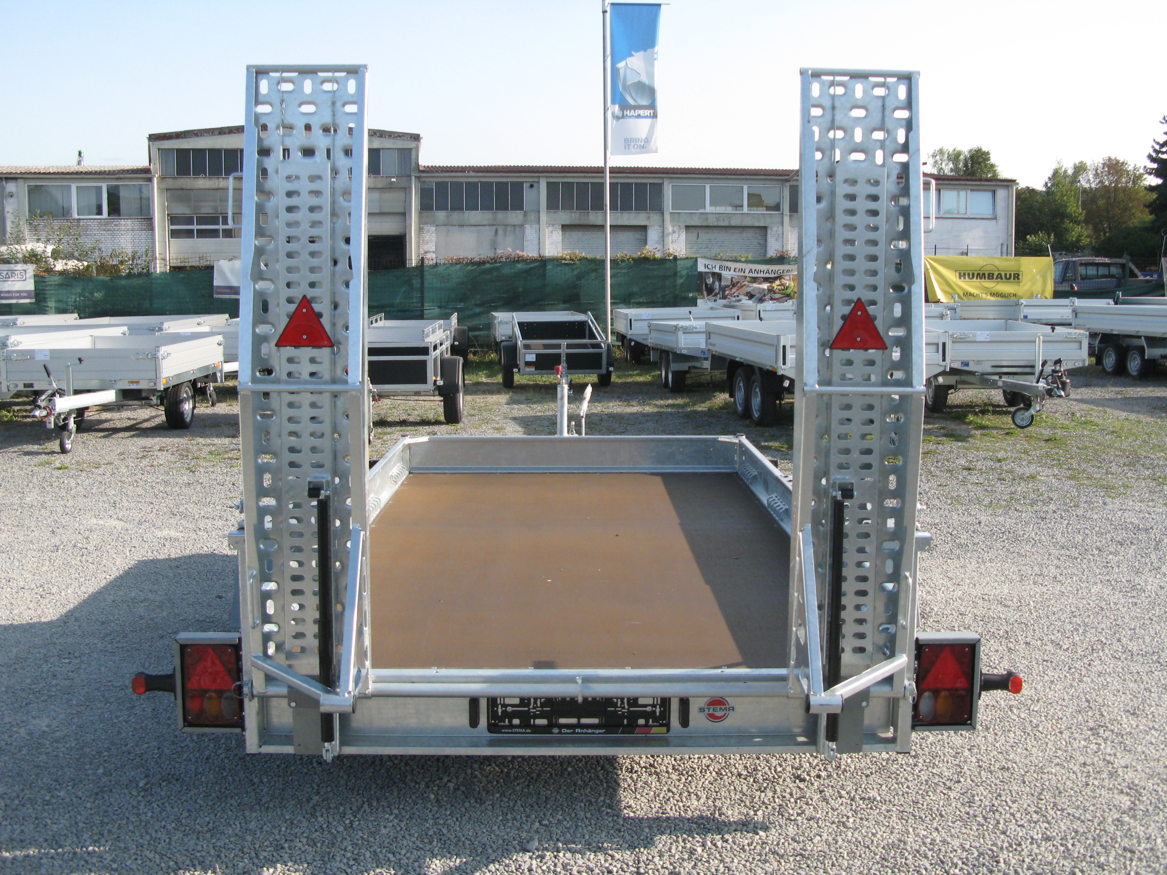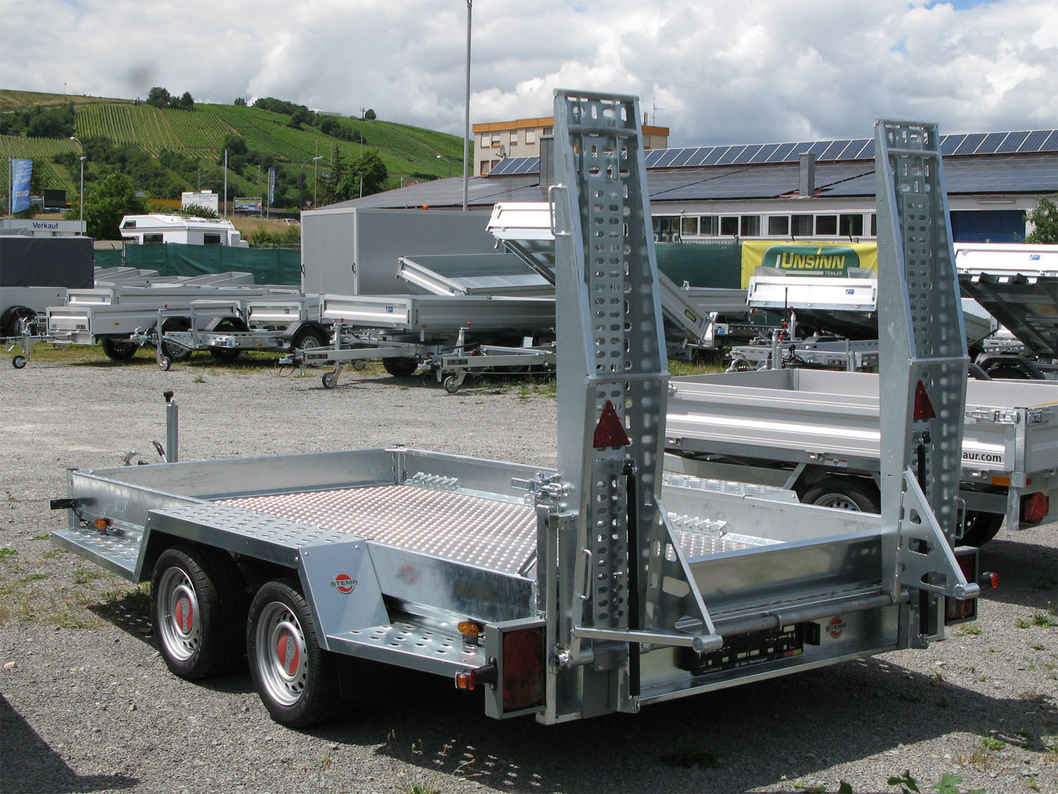 Für jeden Einsatz. Der universell einsetzbare STEMA-Baumaschinentransporter ist der ideale Begleiter für den gewerblichen Einsatz. Baumaschinen und andere Arbeitsgeräte lassen sich durch den extrem niedrigen Auffahrwinkel (18°) über die stabilen Auffahrrampen (1,70 m lang) mühelos verladen. Die Ladehöhe beträgt ca. 46 cm.