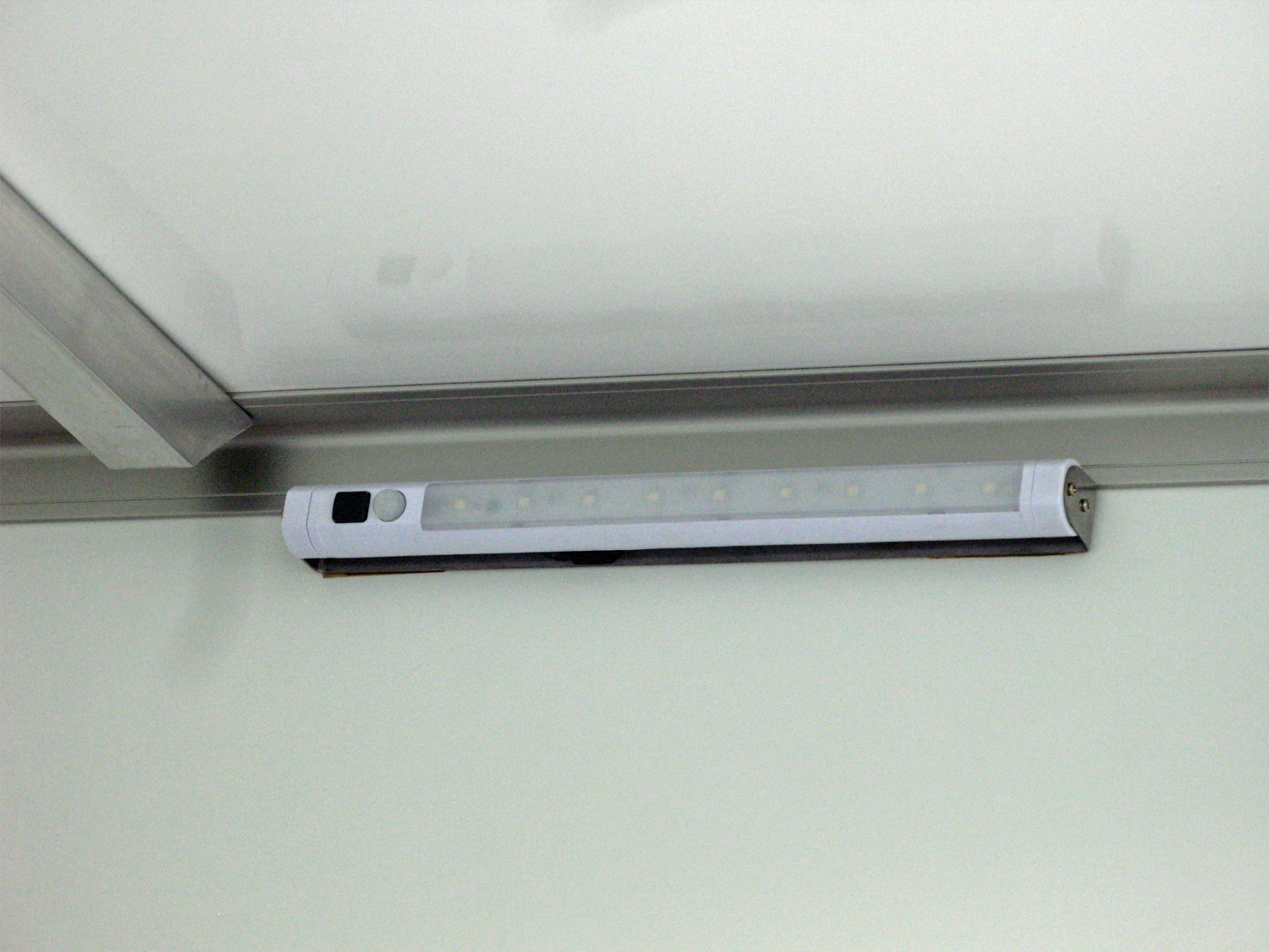 Eine schwenkbare LED-Innenleuchte mit Bewegungsmelder inkl. Batterien zusätzlich montiert